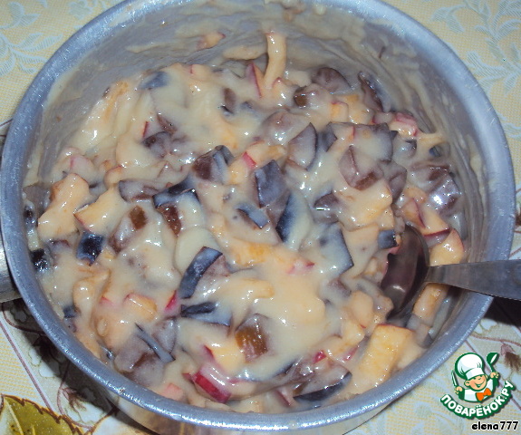 Крем остудить, добавить в него яблоки и сливы, перемешать.