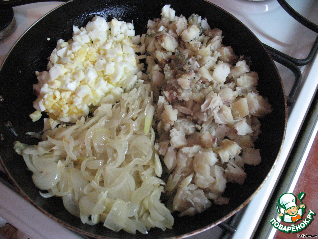К луку, для полной картины, добавляем рыбку и сваренные в крутую яйца. Солим по вкусу, перемешиваем. Начинка готова.