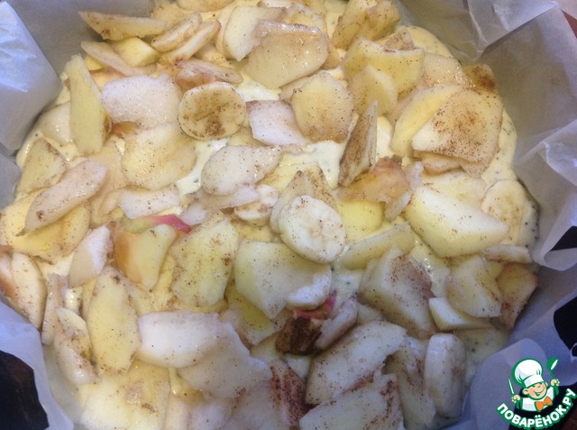 В форму, застеленную пекарской бумагой, выливаем тесто и выкладываем начинку, не прижимая ее в тесто, и отправляем пирог в духовку на 40 мин при 180 гр