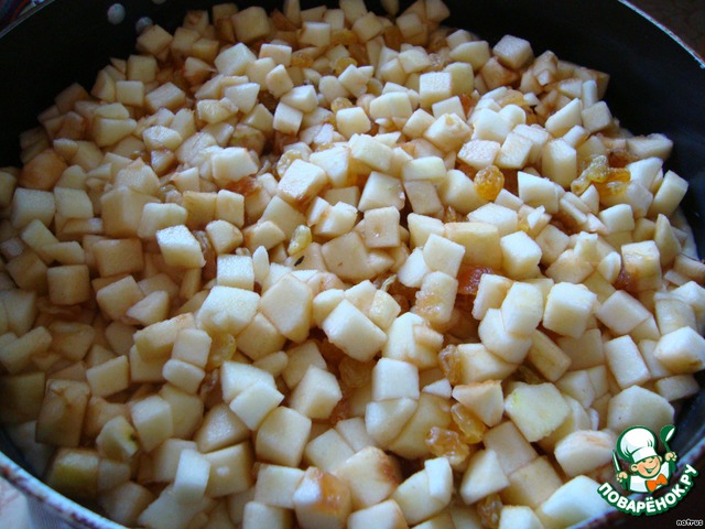Поверх выложить яблоки, предварительно смешав их с изюмом.