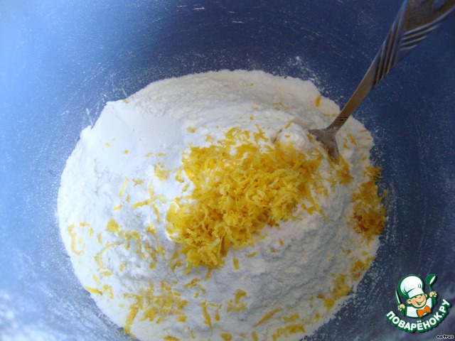 Смешать муку с разрыхлителем и 200 г сахара, добавить цедру, перемешать.