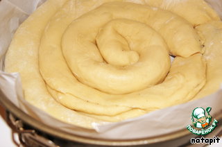 Раскатываем тесто в виде прямоугольника и разрезаем вдоль на три полоски. Маковую начинку выкладываем на середину каждой полосы. Края теста смачиваем молоком и соединяем. Получившиеся трубочки выкладываем по спирали в форму 26 см в диаметре (дно застелить пекарской бумагой).