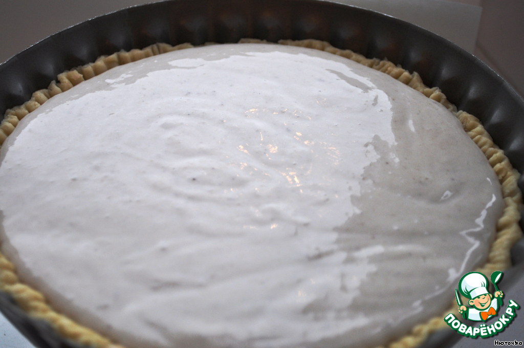 Делаем заливку. Сметану взбиваем с сахаром и ванильным сахаром. Добавляем по ложке крахмала и муки. Ещё раз взбиваем до однородности.
