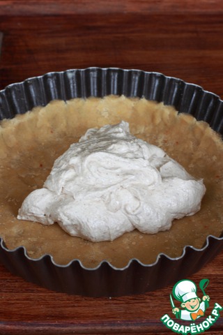 Смазываем форму маслом и распределяем песочную основу (оставьте немного для украшения), придавливая ее ко дну при помощи плоского стакана, а к стенкам - при помощи пальцев. Если масса получится слишком рассыпчатая, добавьте немного холодной воды. Выливаем миндальную начинку, разравниваем ее.