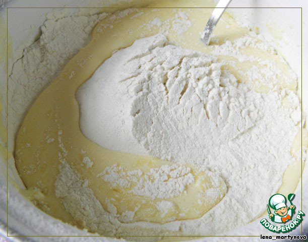 Всыпать муку, перемешанную с разрыхлителем и замесить тесто консистенции густой сметаны.