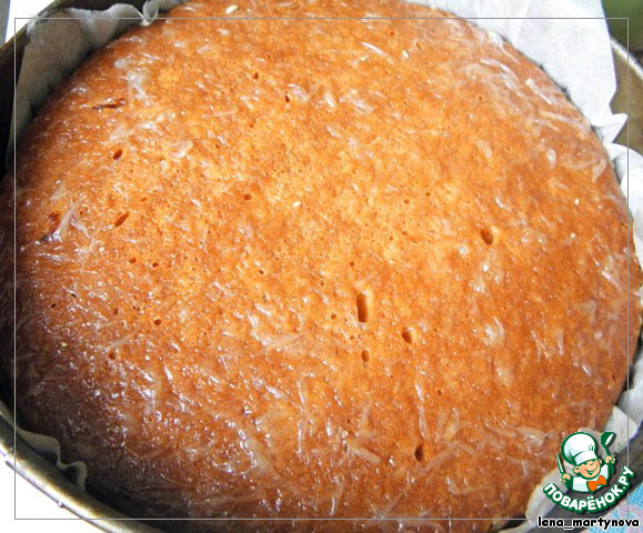 Готовому пирогу дать остыть минут десять. Затем вынуть из формы, снять бумагу и вложить его обратно в форму, только дном кверху.