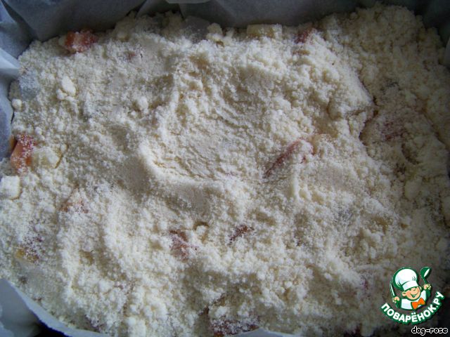Для посыпки масло (обычно советуют брать замороженное и натирать на терке, я беру комнатной температуры и перемешиваю все за полминуты в комбайне), сахарный песок и муку смешиваем в крошку. В зависимости от качества масла может понадобиться чуть больше или меньше муки. Высыпаем крошку поверх фруктов.