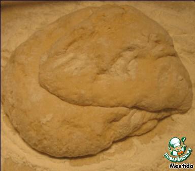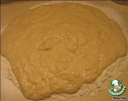 На рабочую поверхность насыпаем горкой грамм 200 муки и выливаем тесто,