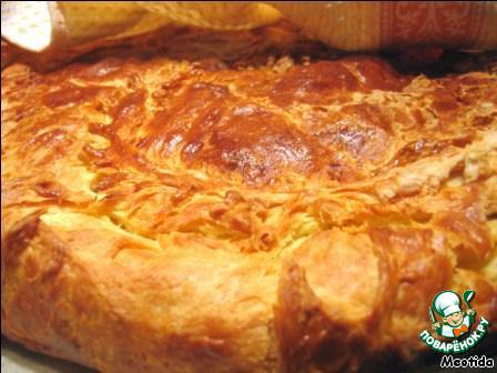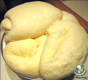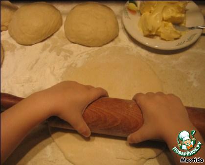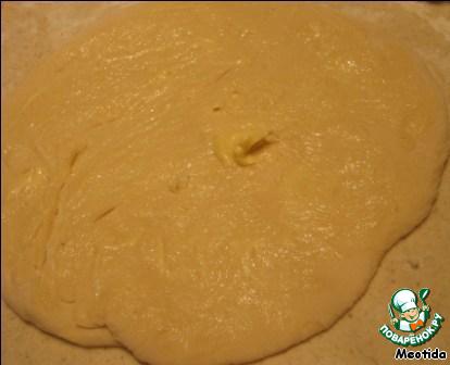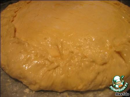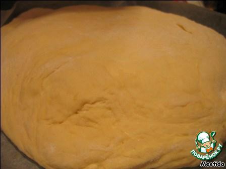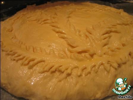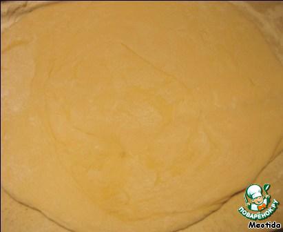 Из двух частей теста раскатываем круг, кладем его на застеленный бумагой для выпекания противень. Оставляем минут на 10, для расстойки.