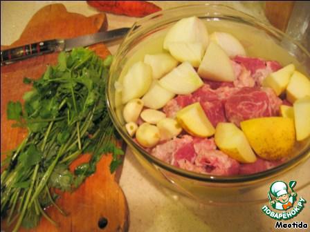 мясо, лук, чеснок, яблоко и зелень перекручиваем в фарш,