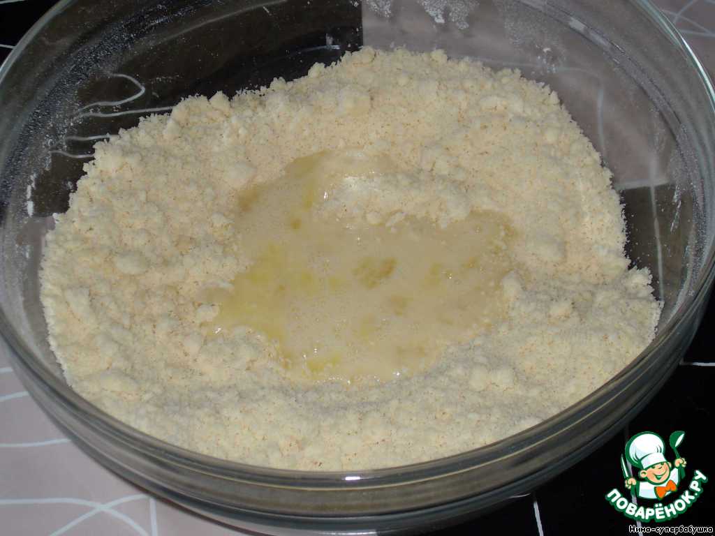 Растереть руками в однородную крошку. Добавить слегка взбитое яйцо и перемешать.