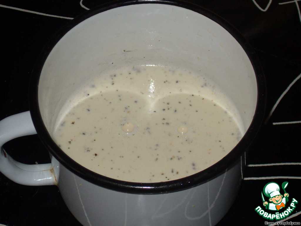 Яйца взбить с солью и перцем, влить сливки и хорошо перемешать.