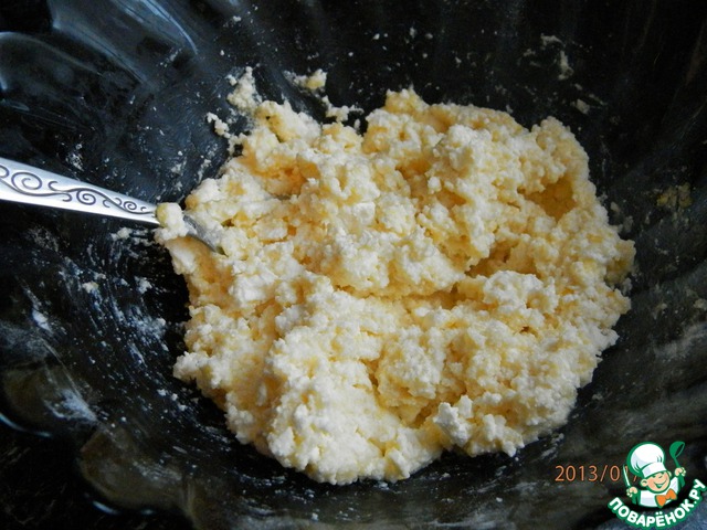 Сначала приготовим творожные шарики. Творог, краxмал, 2 яичныx желтка и саxар перемешать до однородной массы.