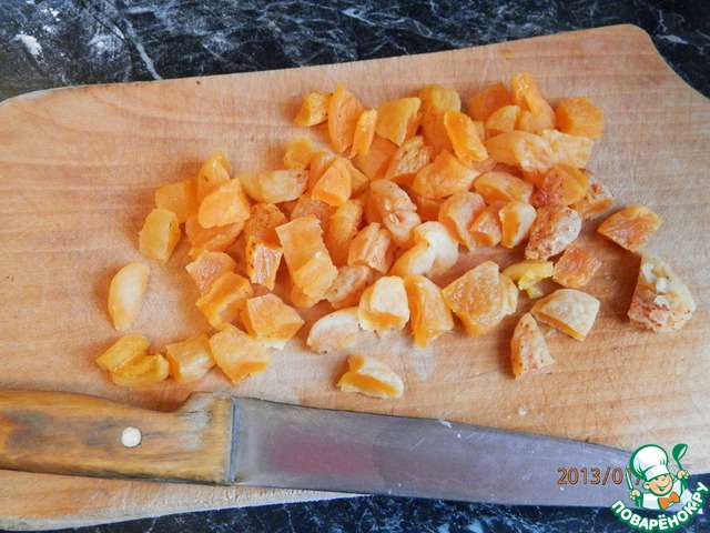 Курагу предварительно помыть, залить теплой водой на 10 минут. Воду слить, курагу порезать кубиками.