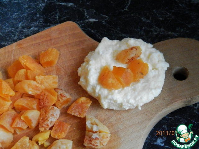 Теперь делаем шарики. Из творога формируем лепешки, внутрь каждой кладем курагу и формируем шарики.