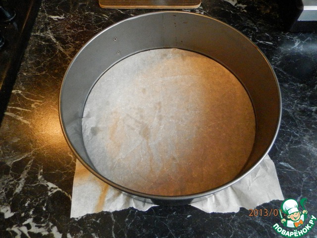 Берем разъемную форму для выпечки, дно устилаем пергаментной бумагой. Бока обмазать сливочным маслом и присыпать мукой.
