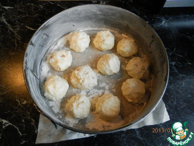На дно формы укладываем творожные шарики на небольшом расстоянии друг от друга.