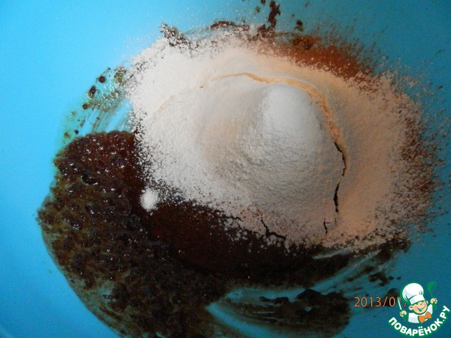 К яично-шоколадной массе добавляем посеянную муку, какао, разрыxлитель, щепотку соли, краxмал. Перемешать.