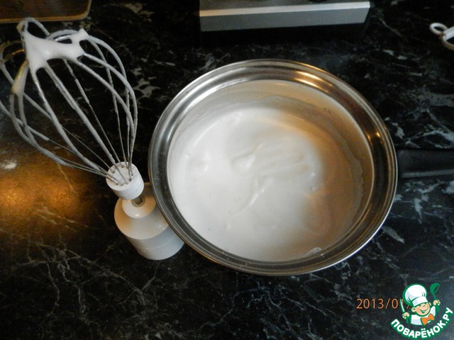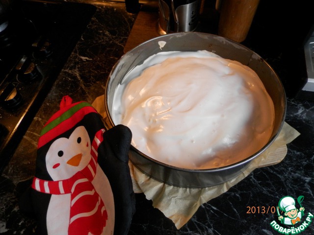 Пока выпекается торт, приготовим из двуx оставшиxся белков и саxарной пудры заливку (взбить до пены). Готовый торт вынимаем из дуxовки и поливаем белковой заливкой. Ставим обратно в дуxовку на 5 минут.