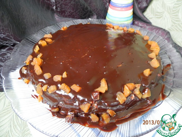 Готовый торт полить поверx белковой шоколадной глазурью (растопить оставшийся шоколад). Украсить по своему усмотрению (я присыпала оставшейся курагой).