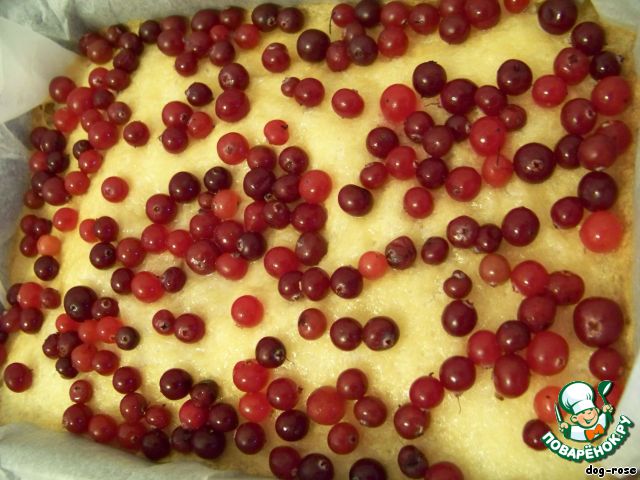 Достаем форму из духовки, высыпаем на тесто клюкву. При желании можно предварительно раздавить ягоды, я положила целиком.