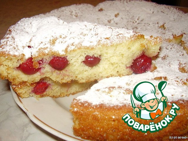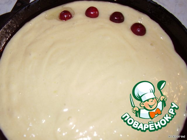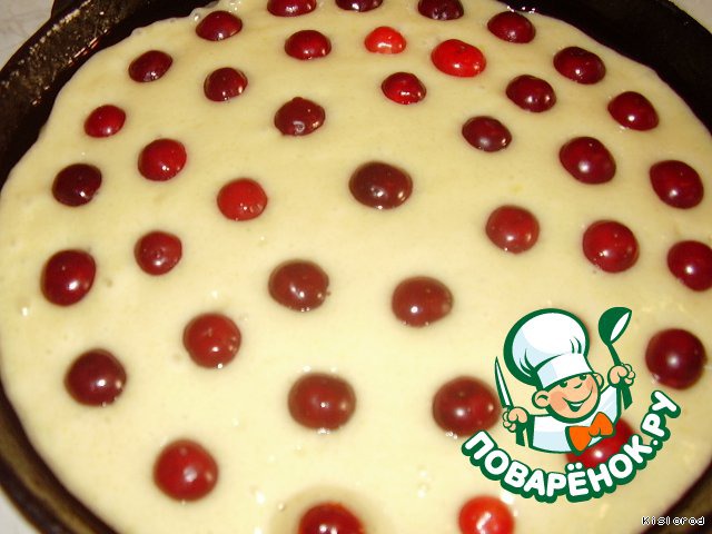 форму смазать растительным маслом, вылить тесто, у черешни удалить косточки (если мало времени,то можно и не удалять) и выкладывать на тесто, слегка вдавливая (чем глубже вдавить, тем меньше их будет видно в готовом изделии)