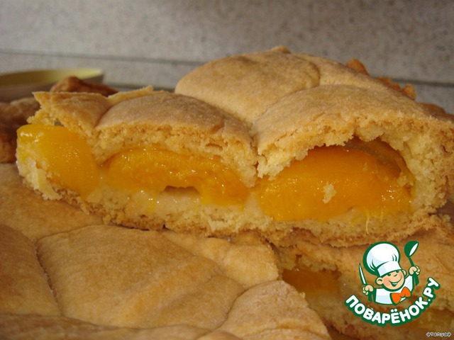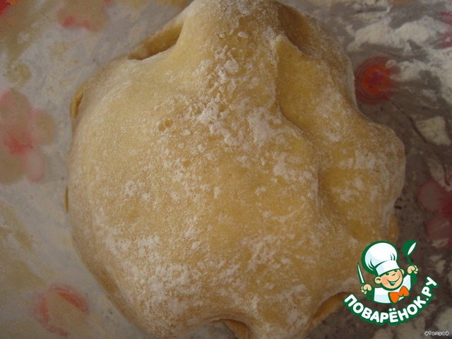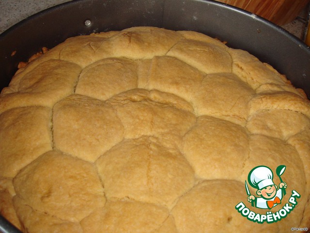 Тесто разделить на 2 части. Каждую часть раскатать по форме противеня толщиной 5 мм. Один слой выкладываем на противень, делаем бортики.