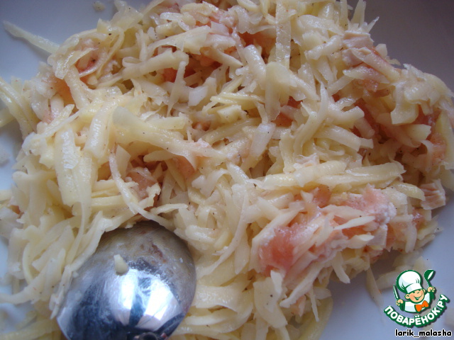 Начинку можно взять любую: у меня был сырой картофель, натертый на терке, с курицей и луком. Естественно, нужно добавить соль и специи по вкусу.