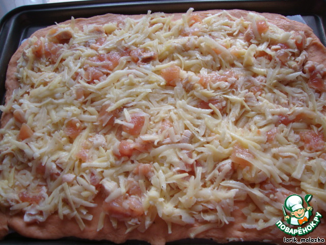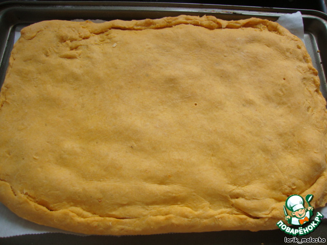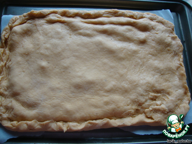 Поделить тесто на 2 части, одну из которых раскатать, желательно не очень тонко, чтобы в готовом пироге четко виднелось тесто.