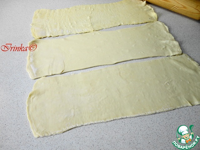 Каждую пластину тонко раскатываем, желательно в одном направлении. Это необходимо для того, чтобы тесто при выпечке поднялось.