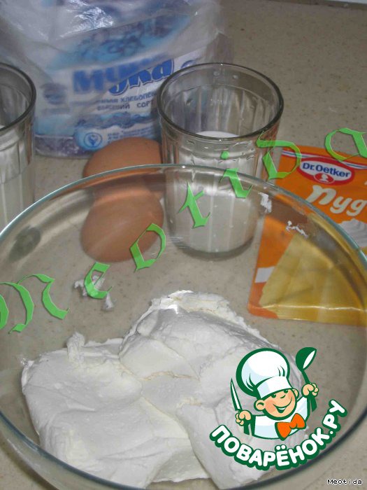 Приготовить ванильную творожную начинку, для этого надо смешать (лучше миксером, блендером или в комбайне) 400гр творога, 1/2 стакана сливок, 1/2 стакана сахара, упаковку сухого ванильного пудинга и 2 стол.л. муки (с горкой) в однородную массу.
