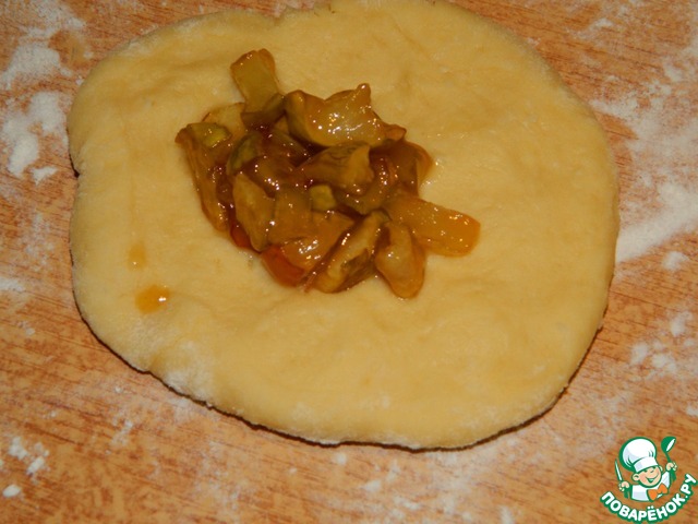 Сделать небольшую лепешку и выложить немного начинки. Защипать края, сформировав булочку.