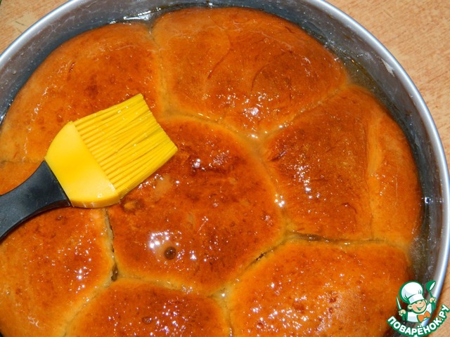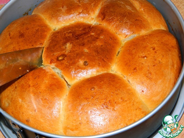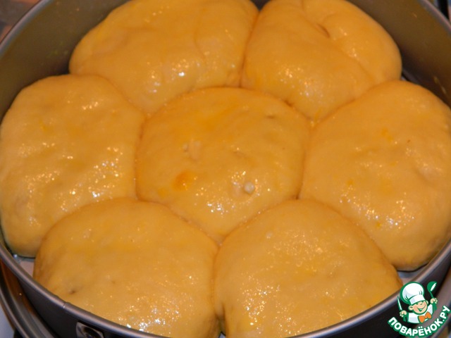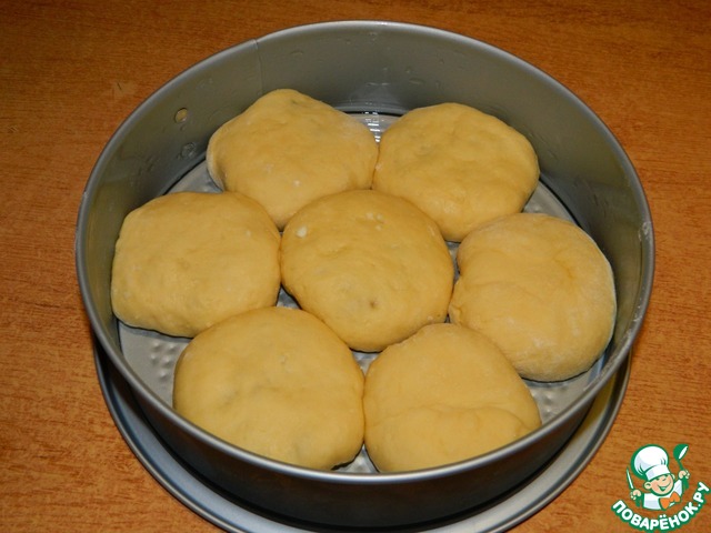 Готовый булочки выложить в смазанную форму для выпечки У меня форма 24 см. Оставить в теплом месте для подхода минут на 15-20.
