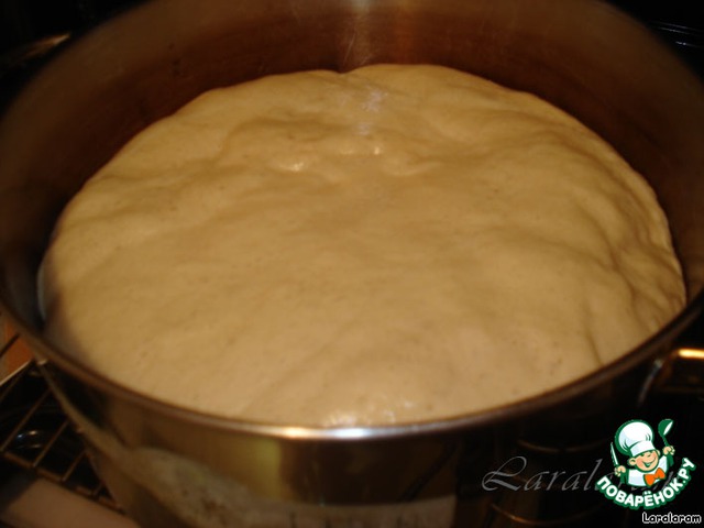 Снова в барокамеру - пусть подходит! Сначала оно стояло у меня в спальне, а там прохладно - не топим (в прохладе лучше сохранюсь!), тесто подходило, но медленно (что само по себе хорошо!), но в тот день у меня приключился припадок кулинарного бешенства - готовила целый день, и уже сил не было ждать, хотя я обычно жду! короче, поставила я его в духовку на 40°.