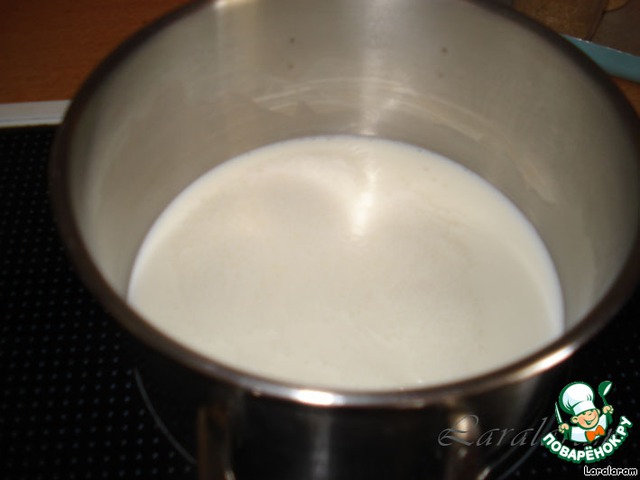 Готовим опару следующим образом: 125 мл молока слегка подогреть,