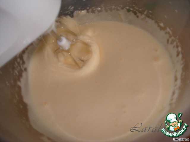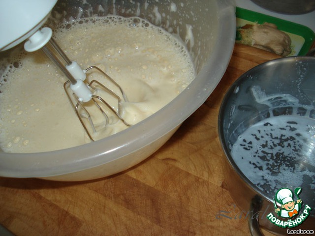 Кипящее молоко влить в яйца, при этом энергично всё мешая, чтоб яйца не свернулись! Дать остыть.