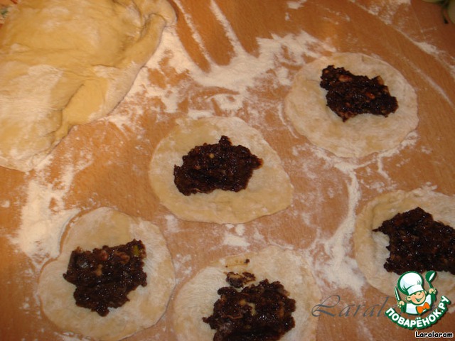 Всё - разделываем! Стол посыпаем мукой, тесто режем кусочками и пальчиками расчмякиваем их в кружочки. Очень приятное в работе это тесто.