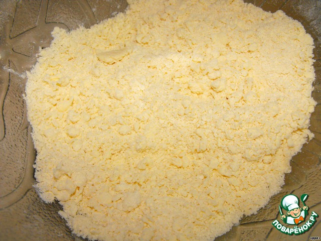 С помощью двух ножей (или в блендере) порубить муку с маслом до образования мелкой крошки.