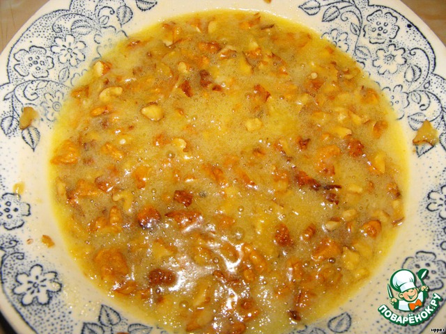 Влить растопленное масло и добавить ванилин, перемешать и всыпать дроблёные орехи.