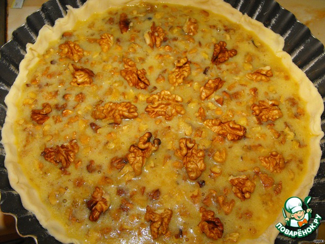 Вылить начинку на дно охлаждённой формы, выложить цельные орехи в желаемом порядке и выпекать 15 мин, затем уменьшить температуру до 170*С и выпекать ещё 15-20 мин, пока корж не зарумянится.