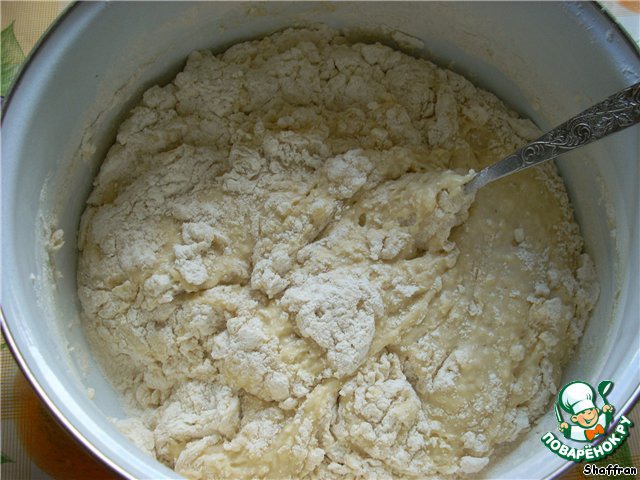 Выливаем в кастрюлю из ковша теплую массу и замешиваем тесто. 4 стакана муки даны приблизительно, обычно требуется немного больше)