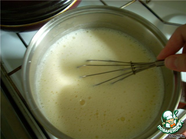 Выключаем огонь под ковшиком. В отдельной миске взбиваем яйца и, продолжая взбивать, добавляем в ковш с растопленным маргарином.