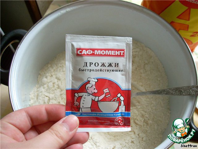 Пока в ковшике масса немного остывает, в большую кастрюлю насыпаем муку и дрожжи. Хорошенько перемешиваем