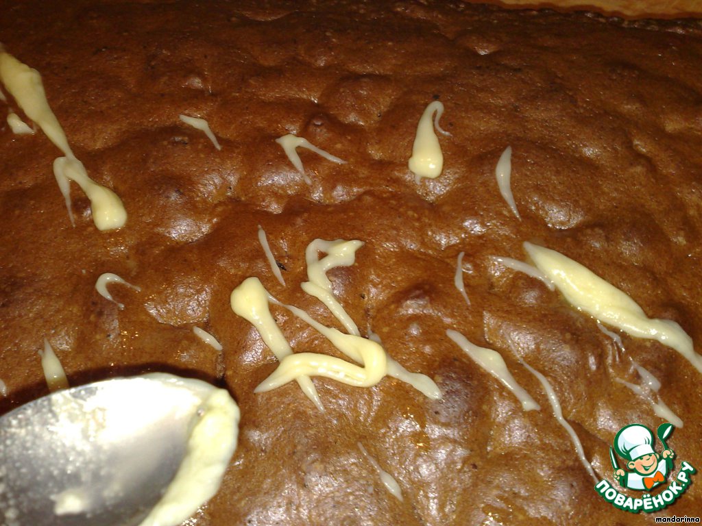 Пока пирог печется, белый шоколад ломаем на кусочки в небольшую кастрюльку и на водяной бане, помешивая, доводим его до состояния мягкой массы, слегка остужаем.