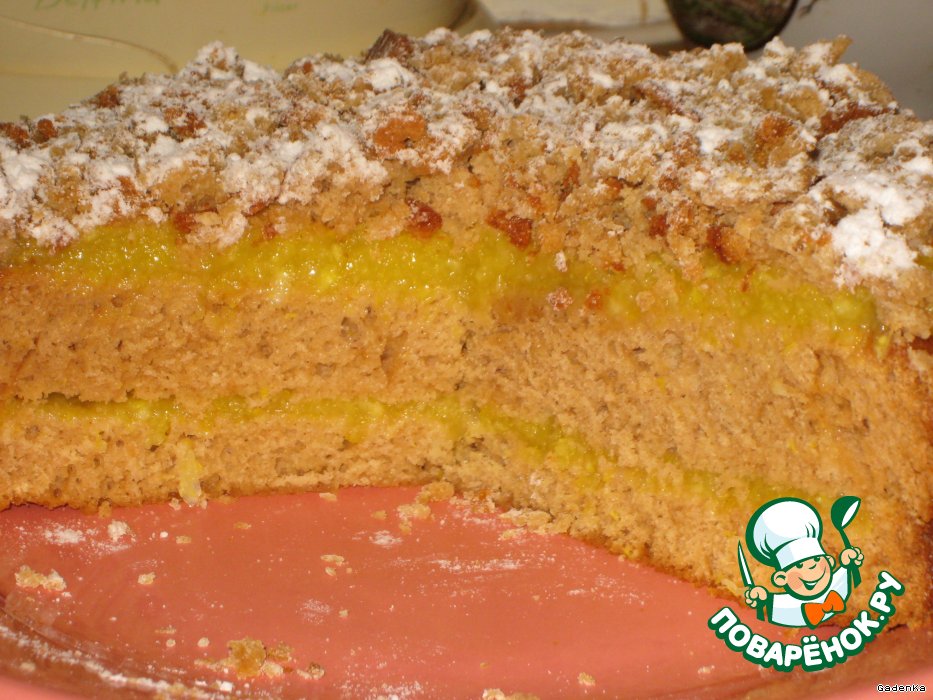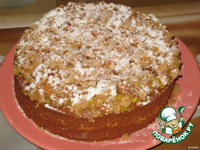 Но т.к. у меня не получилось натуральной эстетичной красоты, то верхний корж я так же смазала и выложила крошки от «выросшей горы», сверху присыпала сахарной пудрой.