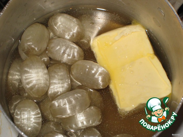 Воду, сахар, маргарин и карамельки поставить на огонь и помешивая растворить всё в однородный сироп.