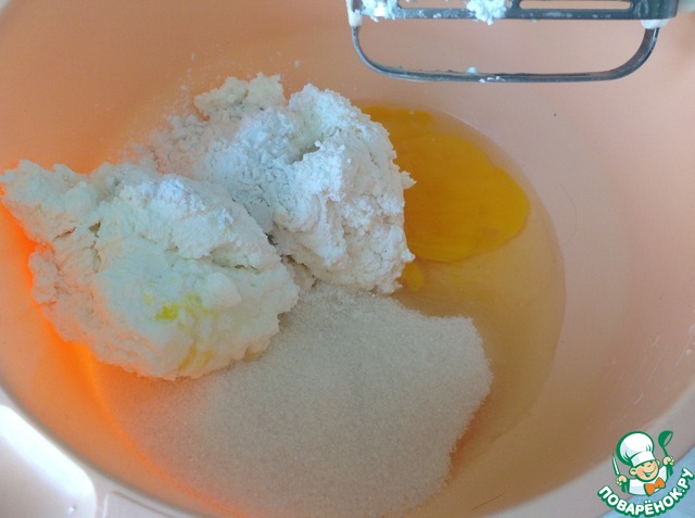 В творог добавляем 2 яйца, ванилин, сахар и крахмал, слегка взбиваем
