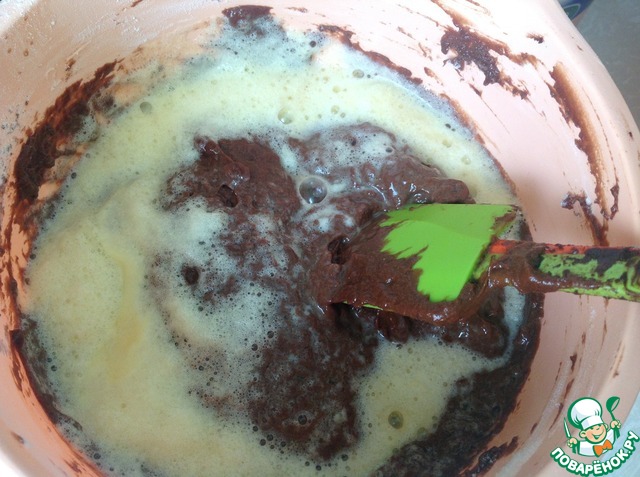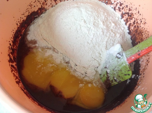 К остывшей шоколадной массе добавляем 4 желтка, разрыхлитель и муку. Вымешиваем тесто лопаткой, не взбиваем