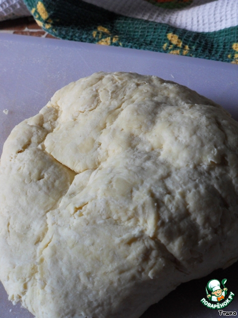 Приготовить слоеное рубленое тесто, для этого в миску просеять 400 г муки, натереть на терке 200 г сливочного масла, растереть, добавить 10 ст.л. ледяного молока или воды.