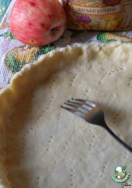 Тесто выложить в форму диаметром 28 см, наколоть и отправить в холодильник на полчаса.